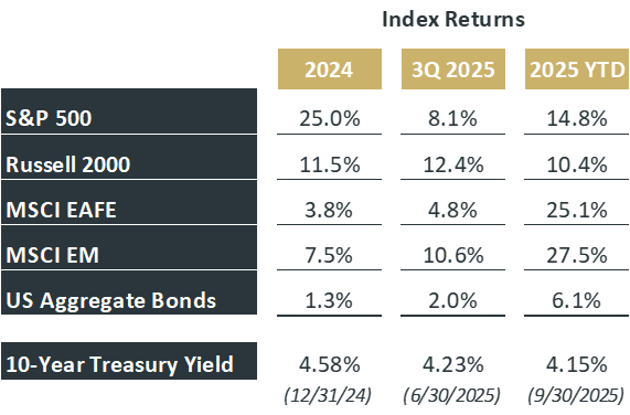 International equities also delivered impressive results. Developed markets, as measured by the MSCI EAFE Index, rose 4.8% in Q3 and are now up a remarkable 25.1% year-to-date benefiting from currency tailwinds, stabilizing energy prices, and stronger than expected growth in Europe and Japan. Emerging markets continued to shine, gaining 10.6% for the quarter and 27.5% year-to-date, fueled by a rebound in China’s tech and consumer sectors and sustained strength across Latin America.